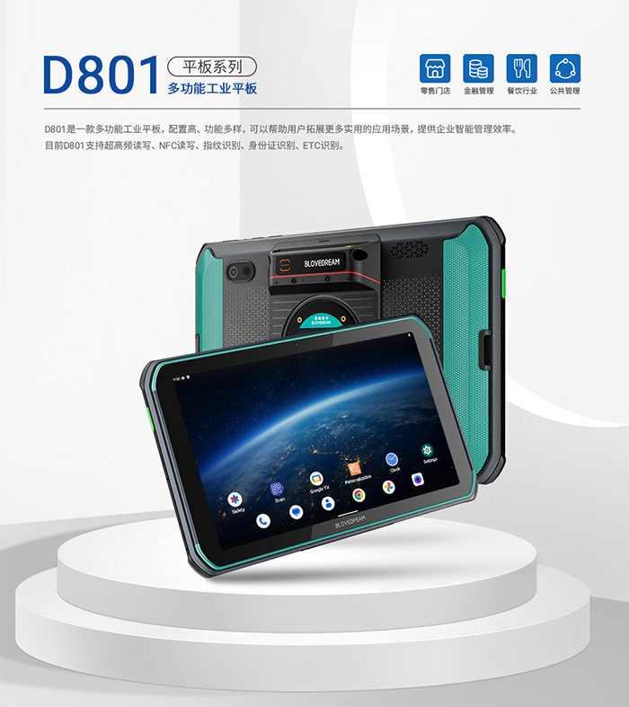 D801是一款多功能工业平板,配置高、功能多样,可以帮助用户拓展更多实用的应用场景,提供企业智能管理效率。目前D801支持超高频读写、NFC读写、指纹识别、身份证识别、ETC识别。